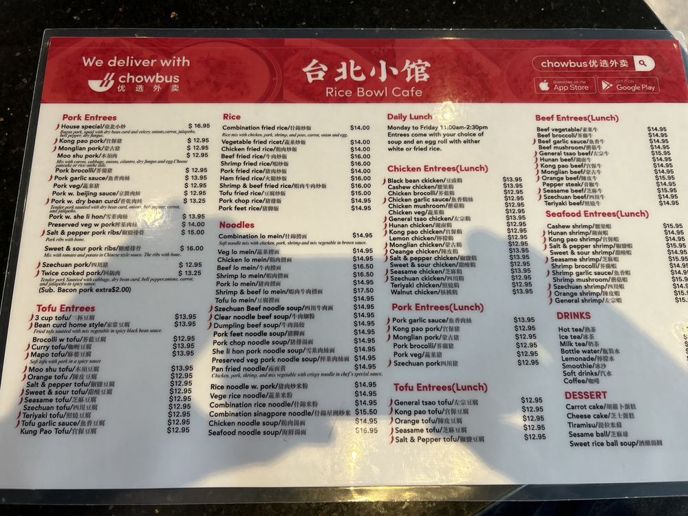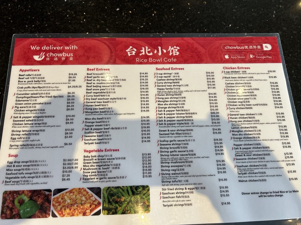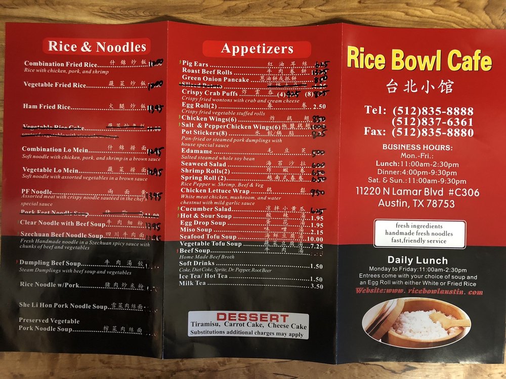 Rice Bowl Cafe is a Chinese-Taiwanese restaurant located in Austin, TX. This casual dining spot offers a wide range of options, including vegan and vegetarian choices. With delivery, takeout, and reservations available, it caters to various dining preferences. The menu features appetizers like Egg Rolls, Shrimp Rolls, and Dumplings, along with flavorful entrees such as Beef Broccoli, Kung Pao Chicken, and General Tso Beef. Customers praise the quick delivery, high-quality food, and generous portion sizes. Reviewers highlight dishes like Three Cup Chicken, Salt and Pepper Tofu, and Spicy Szechuan Beef Noodle Soup. The relaxed ambiance, friendly service, and ample parking make it a great choice for families and groups. Whether dining in or getting takeout, Rice Bowl Cafe offers a satisfying dining experience with an array of tasty options to explore.